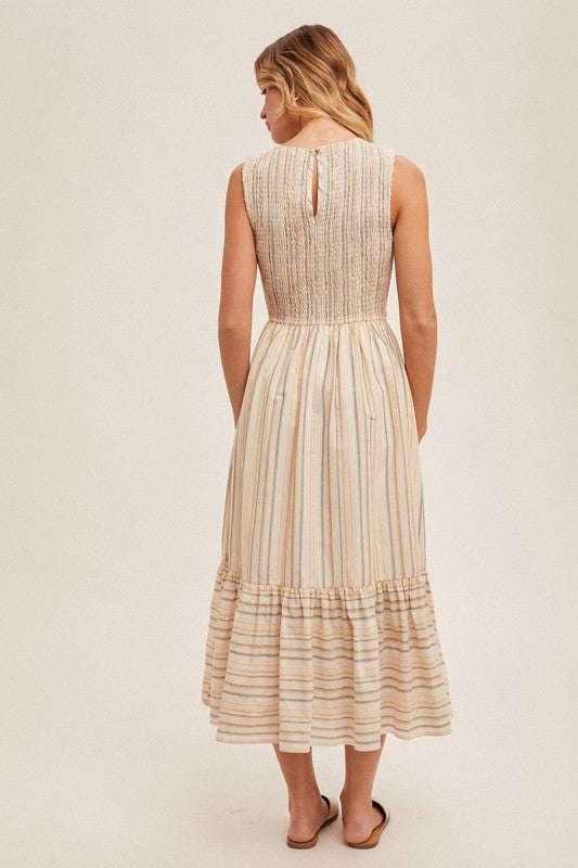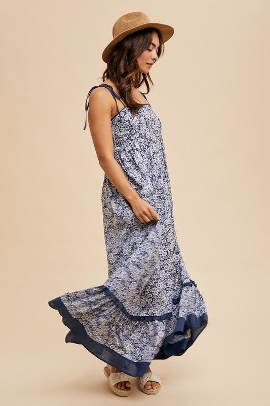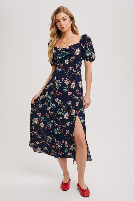 Floral Print Sweetheart Neckline Smocked Back Midi Dress Navy