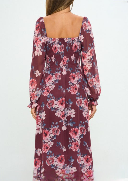 Floral Sweetheart Lace Puff SLEEVE SMOCKED MIDI Dress