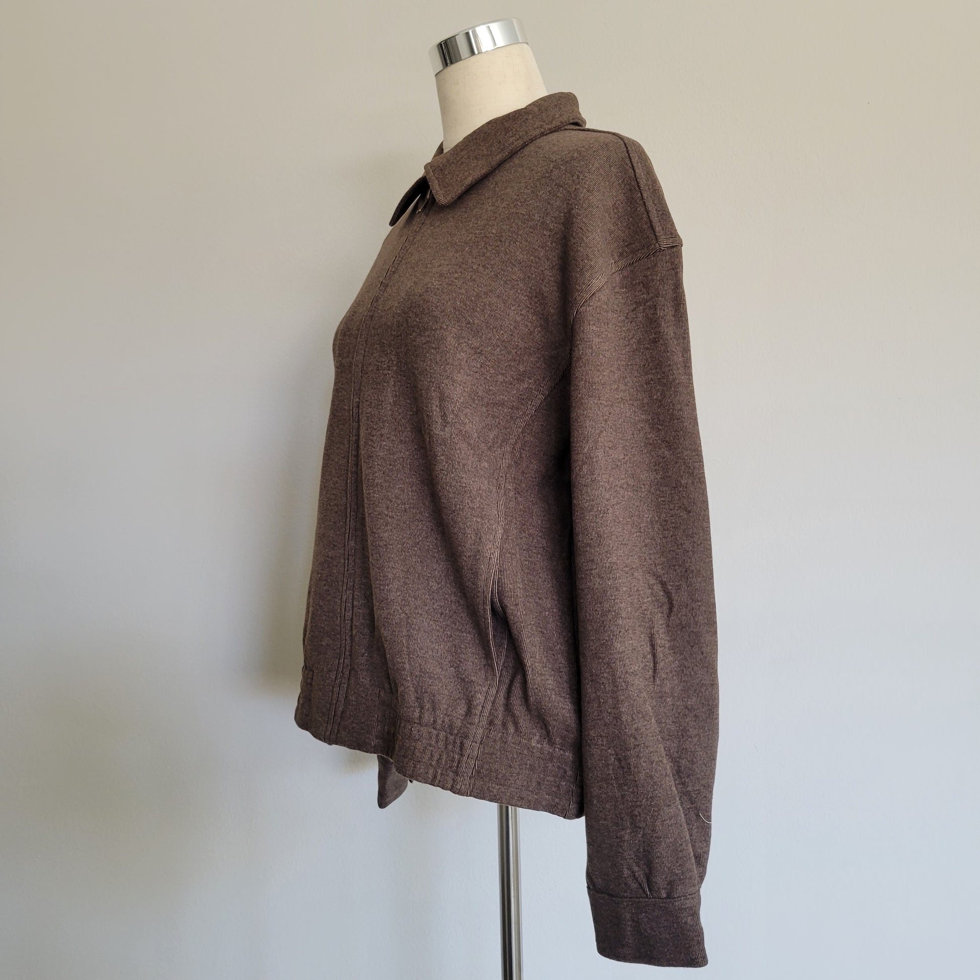 This heavy weight brushed jersey zip jacket in rich brown offers exceptional warmth and comfort with its cozy fabric blend of polyester, rayon, and spandex. Designed with a full front zipper and handy pockets, it combines practicality with style. Perfect for layering on cooler days, this jacket adds a polished yet relaxed touch to any outfit while keeping you comfortably snug.