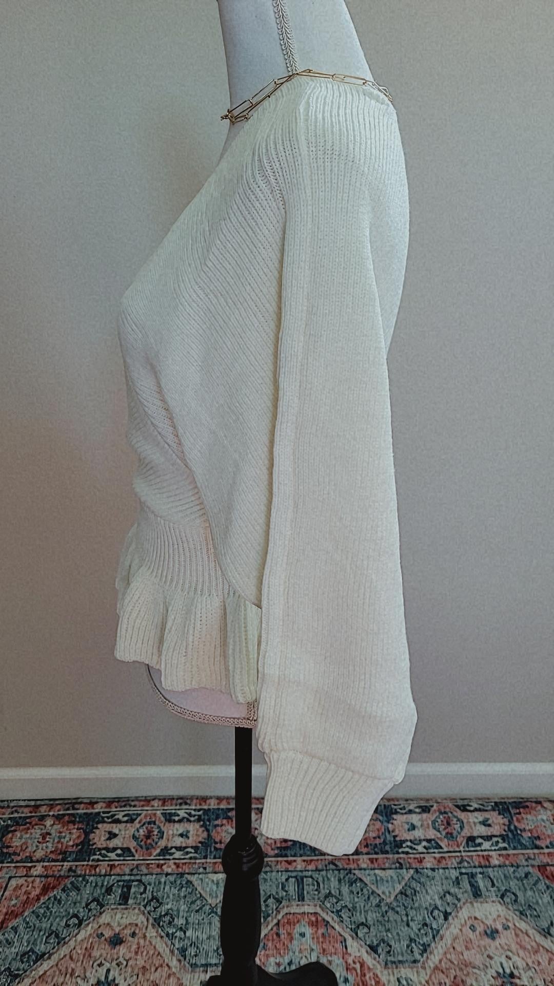 Add a touch of sophistication to your wardrobe with our Long Sleeve Solid Knit Surplice V Neck Sweater. Designed with a fitted waist and delicate ruffled peplum, this sweater is both stylish and flattering. The open back with cross strap detailing adds a sultry touch to this luxurious piece.