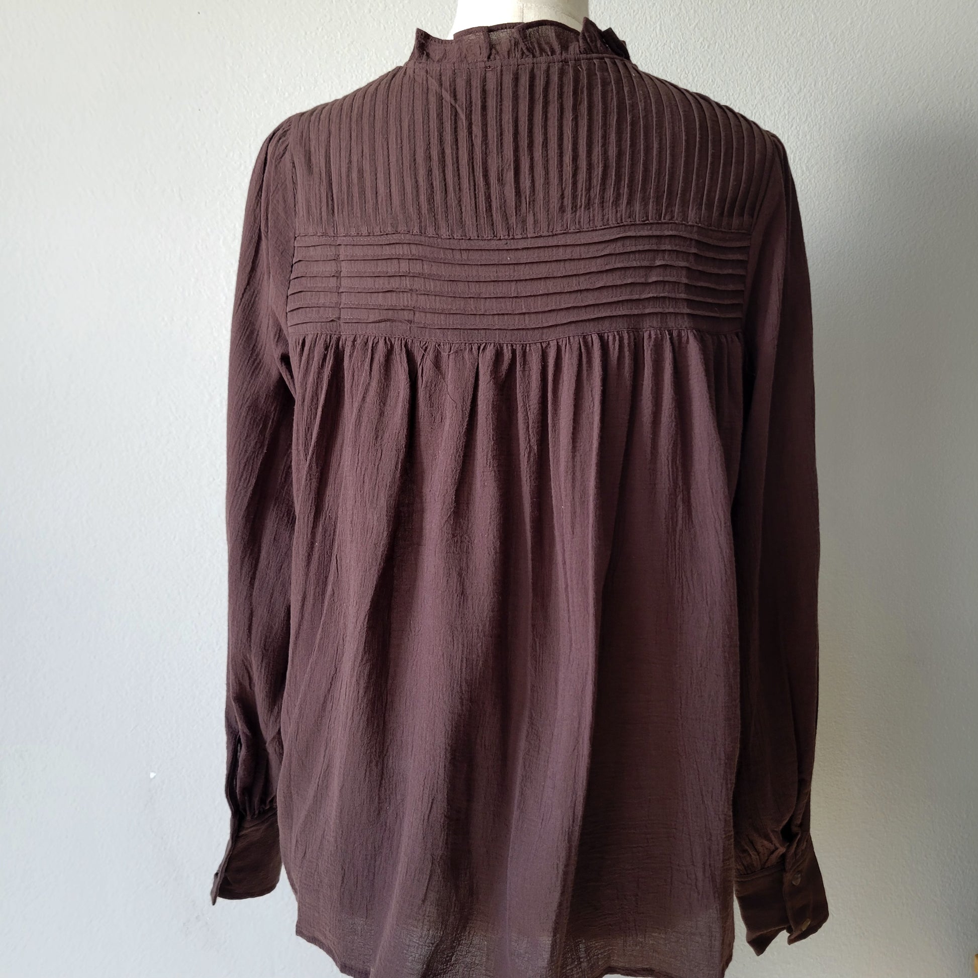 Pintuck Pleated Mock Neck Cotton Blouse Brown