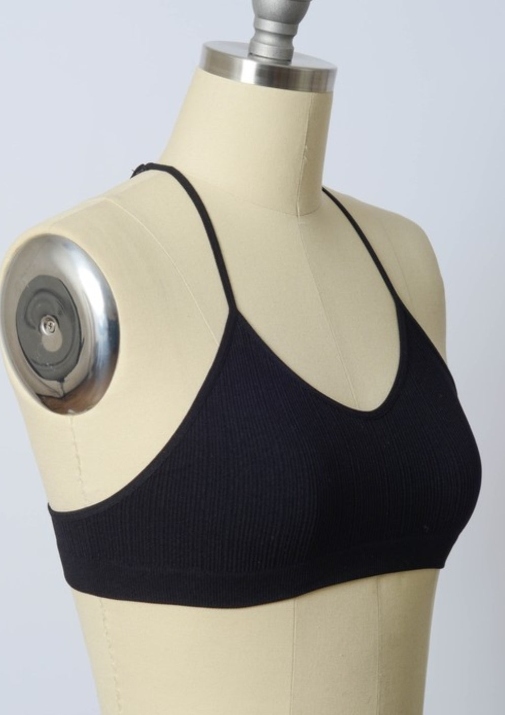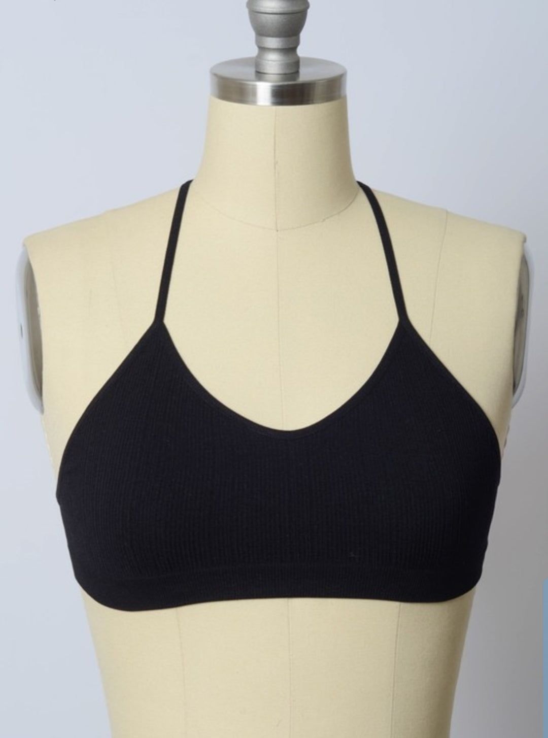 Basic V-neck bralette with halter style shoulder straps. Stretchy ribbed material with contrast mesh back featuring embroidery tattoo detail.