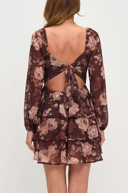 Floral Long Sleeve Triple-layer Mini Dress Brown