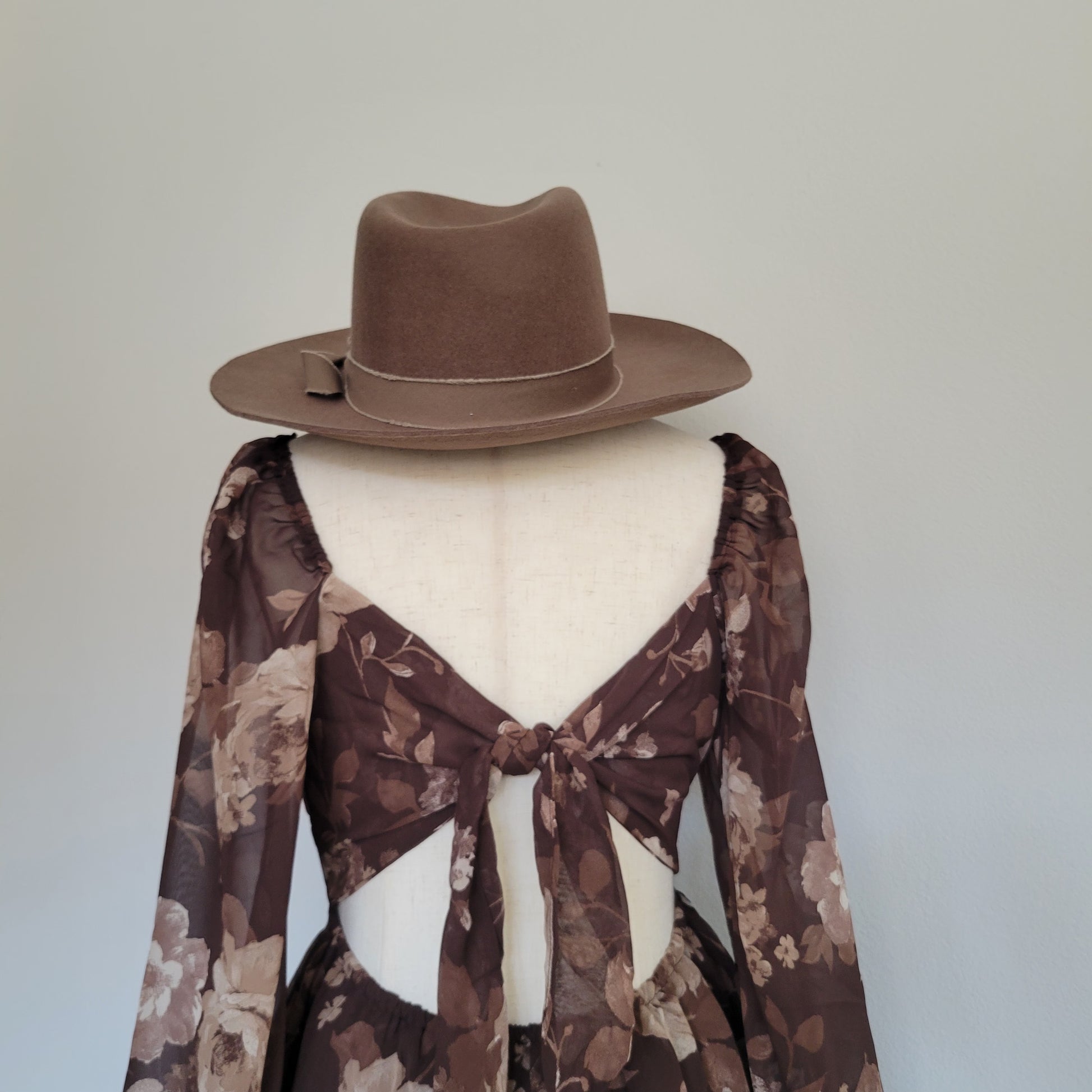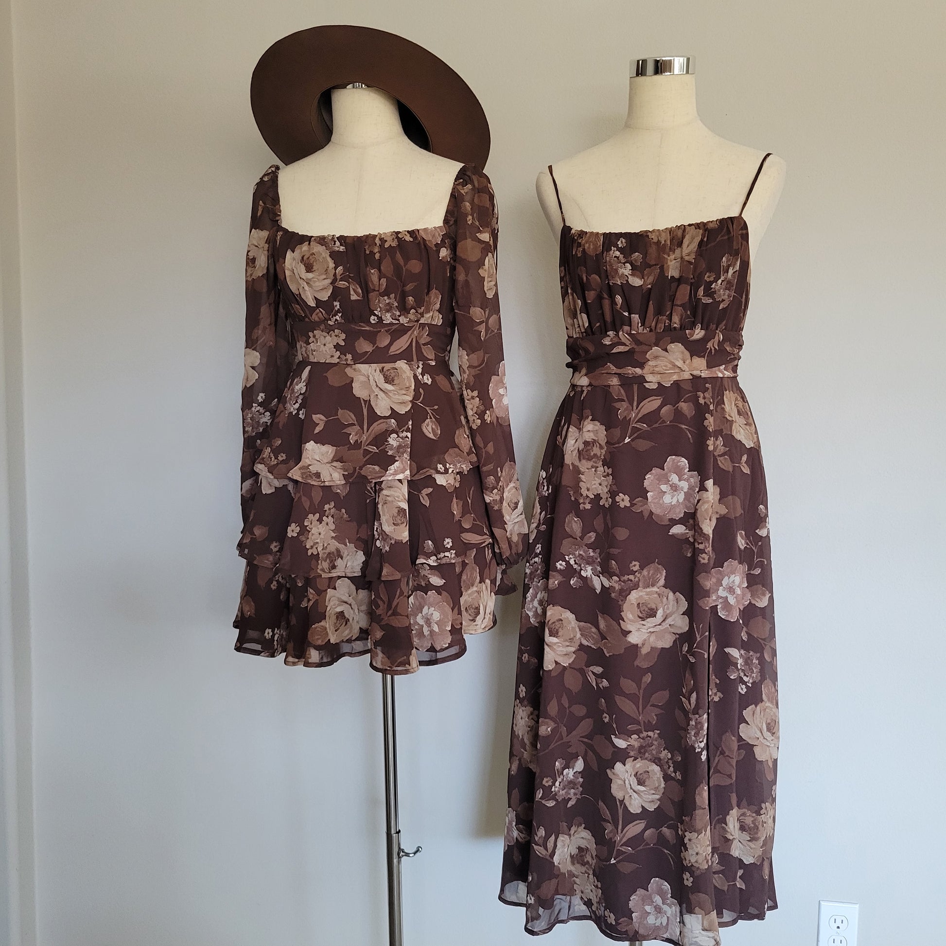 This floral fit-and-flare mini dress showcases a ruched bust and puff long sleeves, creating a delicate yet structured silhouette. The triple-layer ruffle skirt adds volume and movement, while the tie-back detail ensures a customizable fit. Designed for both elegance and comfort, this brown dress offers a refined option for stylish, feminine occasions.