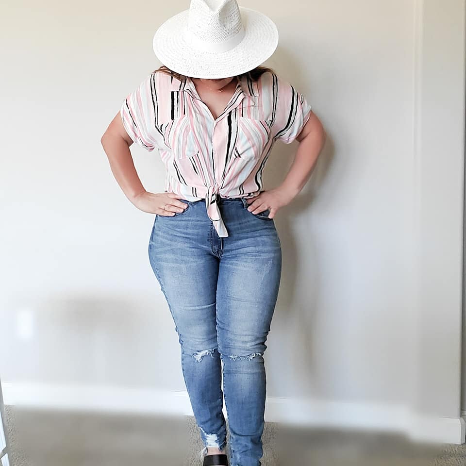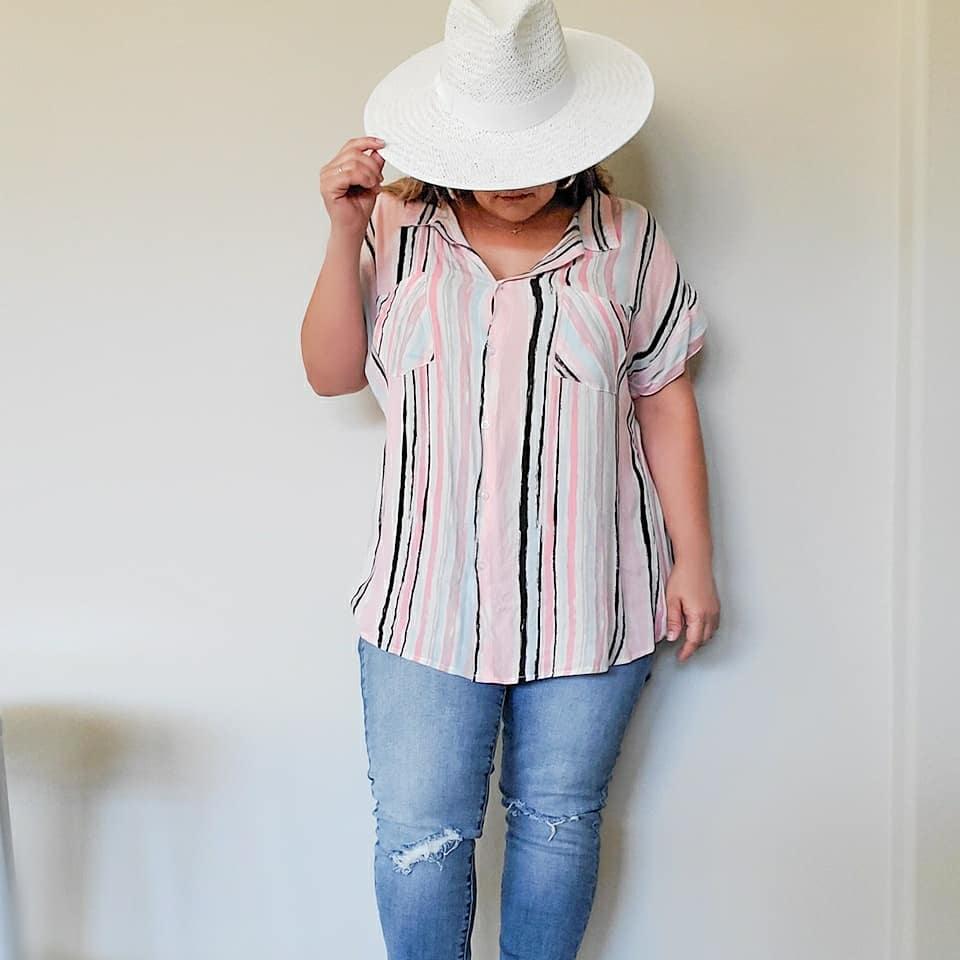 This pastel striped top is the perfect summer vibe! With the perfect details such as pockets on the front ,buttons and collar makes it ideal for grabbing a drinks with your friends on the beach. Pair with white or black jeans and wedges for a trendy happy hour outfit!