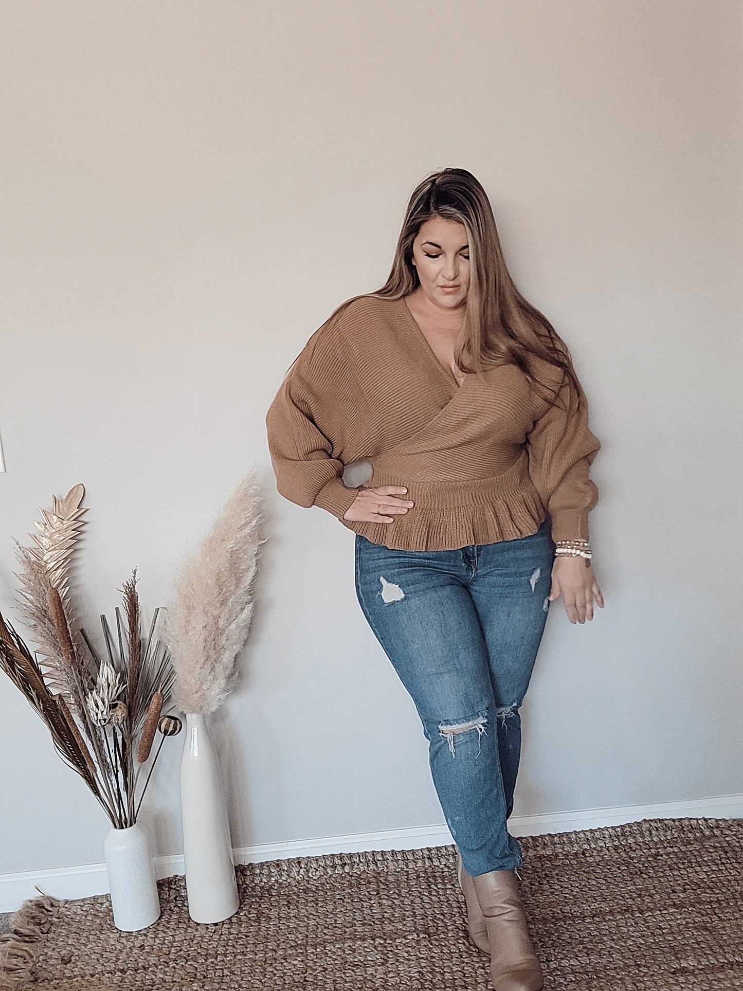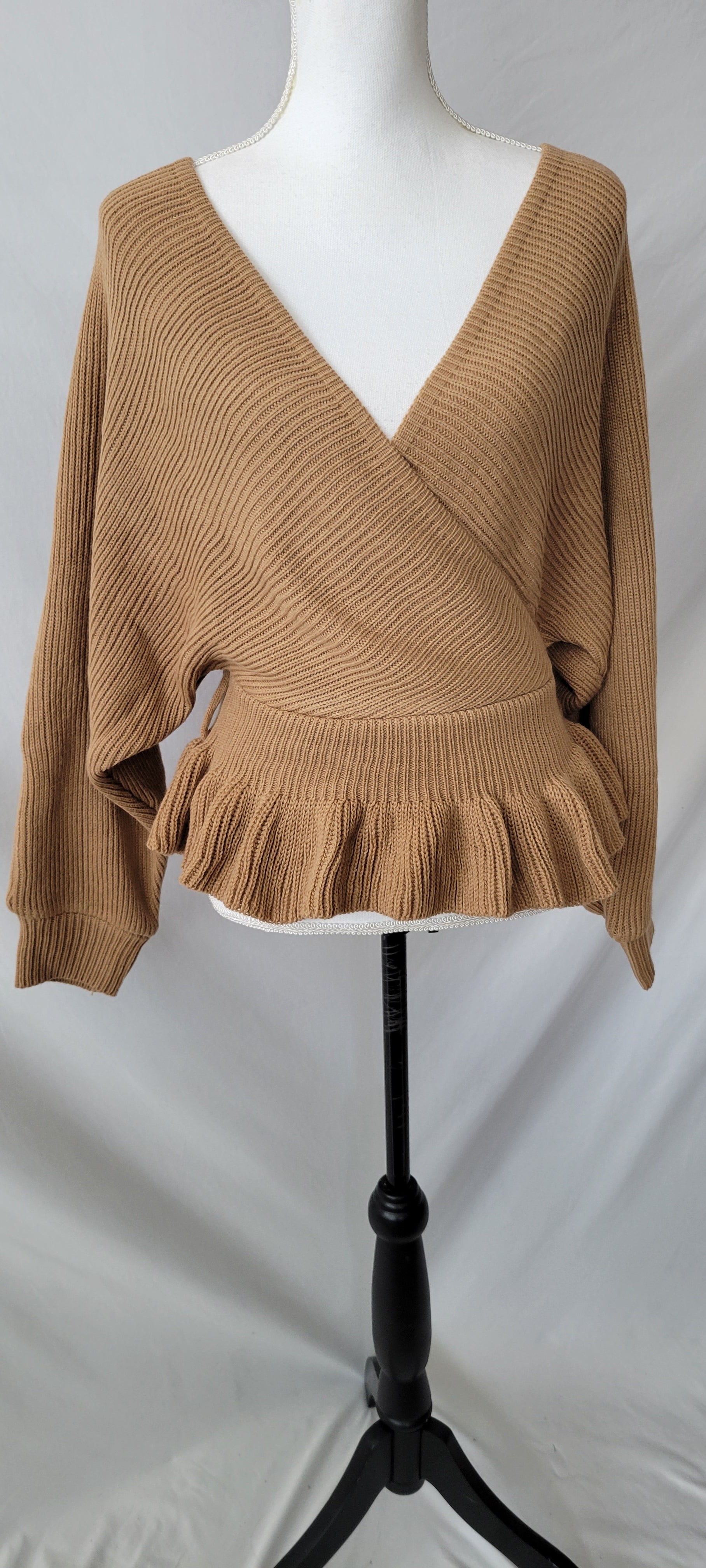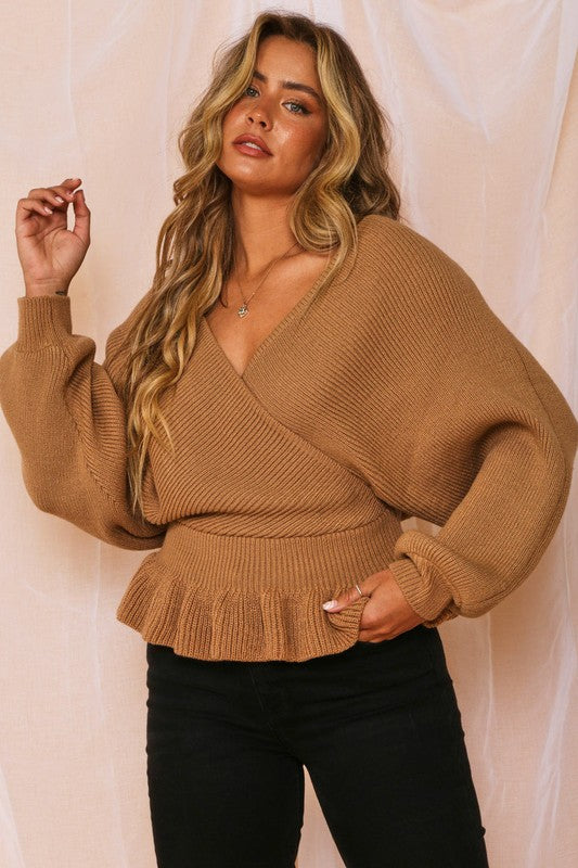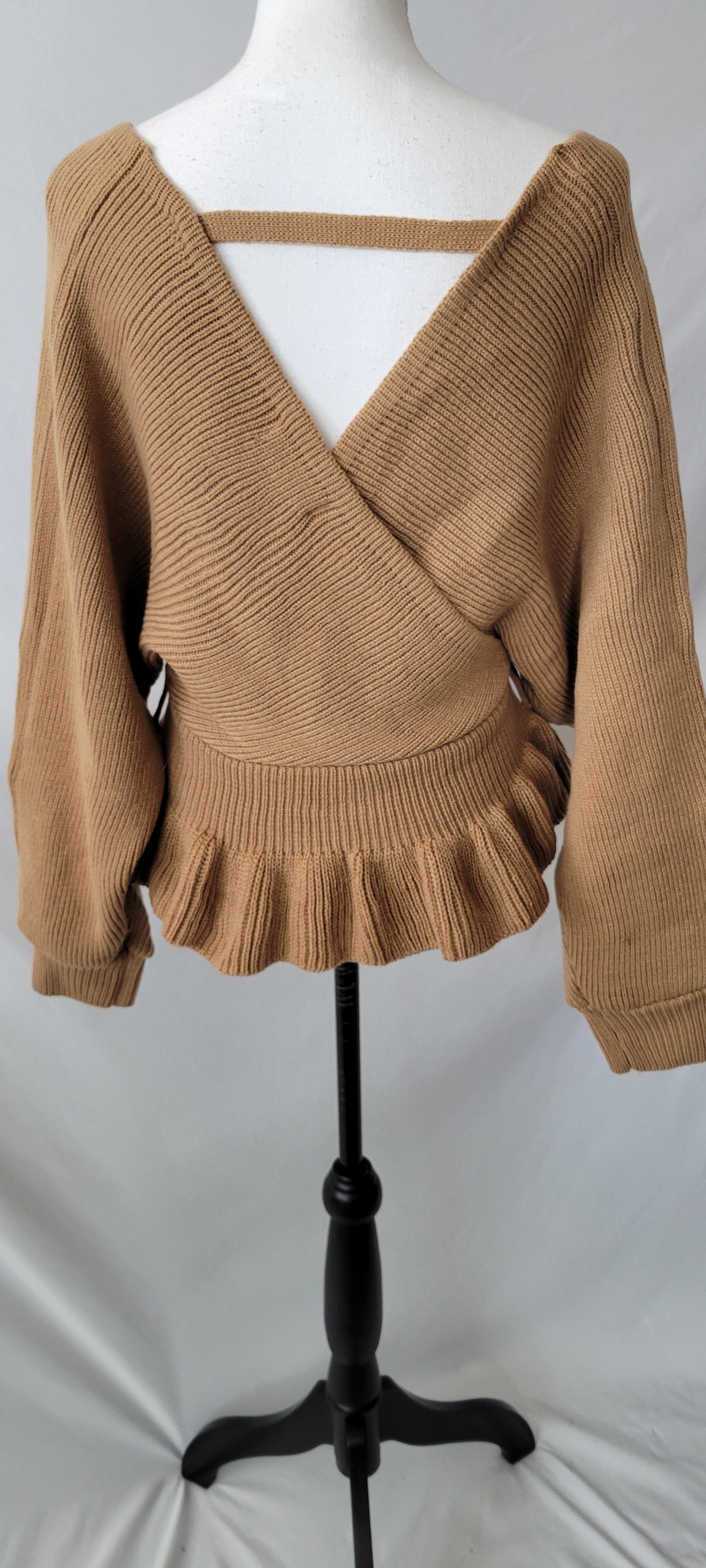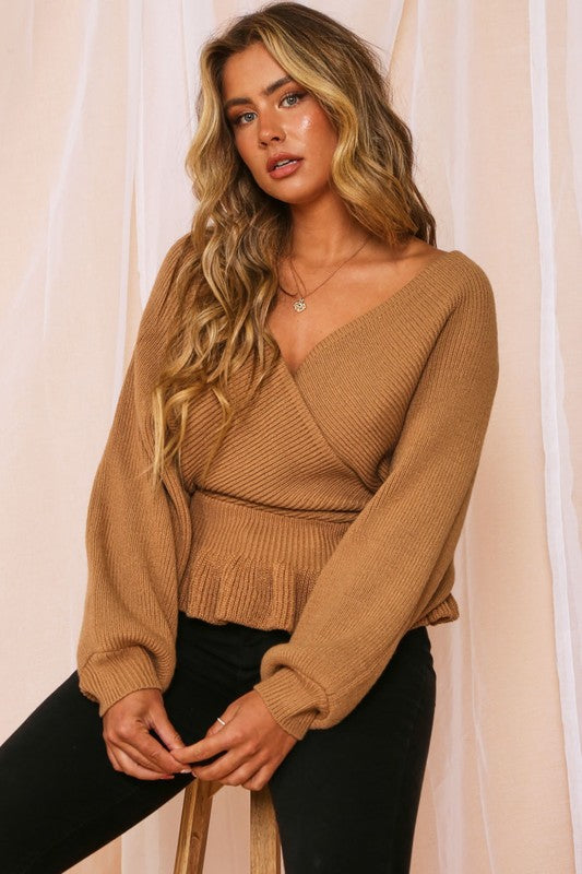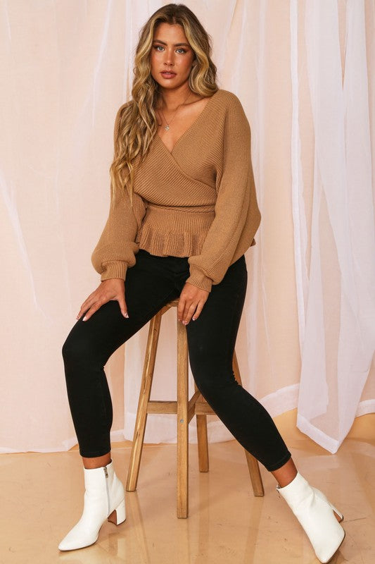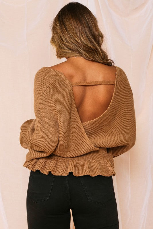 Wrap yourself in elegance with our Long Sleeve Solid Knit Surplice V Neck Sweater in camel. The fitted waist accentuates your figure while the ruffled peplum adds a touch of femininity. But the real showstopper is the open back with cross strap detailing, adding a daring twist to this classic sweater.